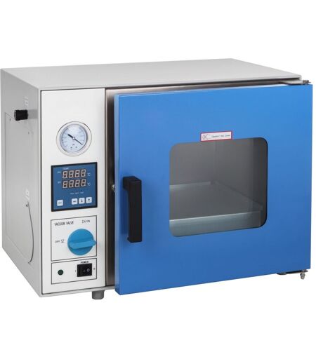 Il potente essiccatore permette un'essiccazione efficiente e delicata di sostanze sensibili al calore e all'ossigeno. È inoltre adatto alla disinfezione e alla sterilizzazione di vari contenitori in vetro. Con un volume interno di 50 litri e ripiani in alluminio posizionabili dove si desidera, è possibile essiccare velocemente e senza la formazione di condensa diversi tipi di strumenti da laboratorio, oggetti e materiali. L'apparecchio è versatile e adatto all'uso professionale in istituti di ricerca, laboratori di fabbrica o università. Il rapido riscaldamento dell'essiccatore da 1450 Watt e la distribuzione omogenea della temperatura garantiscono tempi di utilizzo ridotti. Affinché le temperature e il vuoto generato vengano mantenuti costanti, sull'alloggiamento si trova una guarnizione. Seleziona un intervallo di temperatura preciso tra 50 e 250 °C per il processo di essiccazione. L'impostazione avviene tramite un regolatore PID con una precisione di 0,9 °C. La temperatura di funzionamento attuale viene mostrata sul display al LED retroilluminato. L'essiccatore sottovuoto genera una pressione di 133 Pa o 0,00133 bar e assicura quindi la massima protezione grazie alla costruzione particolare con vetro di sicurezza doppio spesso 15 mm. Una maggiore sicurezza viene offerta dalla protezione integrata contro il surriscaldamento e dal manometro analogico che permette il controllo della pressione. Inoltre, la finestra di ispezione permette un comodo controllo del processo di essiccazione. L'interno dispone di angoli arrotondati ed è stato creato in acciaio inox di alta qualità, in questo modo l'essiccatore ad armadio può essere pulito in modo veloce, affidabile e semplice. ...