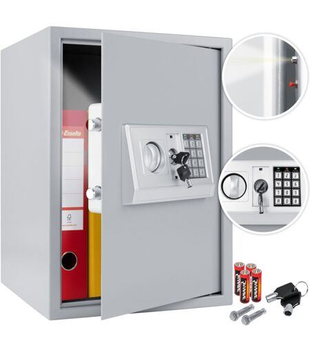 Cassaforte Dual di grandi dimensioni con serratura a combinazione elettronica e chiave di sicurezza. KESSER la SICUREZZA di avere un buon partner! La nostra cassaforte elettrica è un eccellente dispositivo di sicurezza, che i ladri non riusciranno a scassinare. L'installazione non richiede alcuno sforzo ed è relativamente semplice. Soprattutto di questi tempi, si rivela uno strumento pratico e utile. Infatti, grazie al segnale elettrico, la tradizionale chiave non è più necessaria. Grazie a una profondità di 400 mm, è ideale come tesoretto per i documenti per la casa o l'ufficio. Lo sportello in acciaio di 4 mm di spessore tiene al sicuro dai furti tutti i tuoi documenti, contanti, gioielli o fascicoli importanti. La cassaforte è dotata anche di un • display • digitale LCD con segnale acustico di funzionamento. Il sistema di chiusura con 2 robusti cilindri d'acciaio consente di bloccare lo sportello d'acciaio in modo sicuro. Potrai programmare tu stesso il codice della tua cassaforte ...