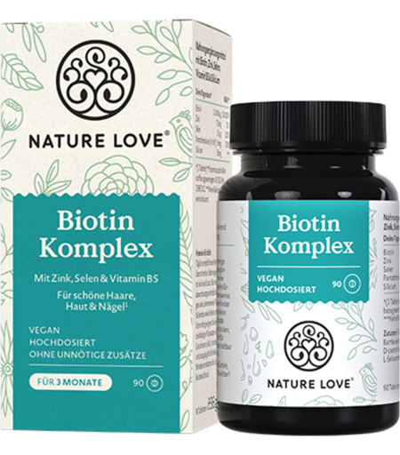 Complesso di biotina – un'eccellente combinazione di vitamine per capelli, pelle e unghie. La biotina, vitamina B7 o vitamina della bellezza, è una delle vitamine idrosolubili del gruppo B. È spesso parte integrante dei complessi di bellezza, poiché è nota per i suoi effetti benefici nel mantenimento della salute della pelle, dei capelli e delle mucose. Nell'alimentazione si trova nel lievito di birra, nel fegato, nei fiocchi d'avena, nei funghi, nel tuorlo d'uovo, nelle sardine, ma la quantità di biotina in esso contenuta diminuisce con la cottura e la lavorazione del cibo. Una compressa (dose giornaliera raccomandata) contiene ben 10.000 µg di biotina. Le compresse del Complesso di biotina del marchio Nature Love contengono un'ottima combinazione di vitamine e minerali che contribuiscono: a mantenere i capelli sani (biotina, zinco, selenio), a mantenere unghie (zinco e selenio) e pelle (biotina, zinco) sane, a proteggere le cellule dallo stress ossidativo (zinco, selenio), al funzionamento del sistema immunitario (zinco, selenio), alle prestazioni mentalia e a ridurre la stanchezza (acido pantotenico). La biotina contribuisce anche al metabolismo dei micronutrienti, al rilascio di energia durante il metabolismo, al normale funzionamento del sistema nervoso e anche alle normali funzioni psicologiche. Il prodotto è un integratore alimentare. ...