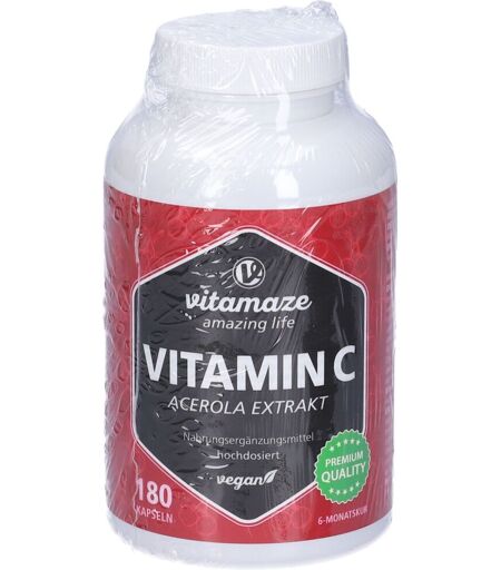 Gli integratori non sostituiscono un’alimentazione equilibrata e variegata e uno stile di vita sano. Integratore alimentare. Vegan. Ingredienti: Estratto di acerola (vitamina C) (Malpighia glabra L., frutto), involucro della capsula (idrossipropilmetilcellulosa). Contenuti medi per 1 capsula %Vnr* Estratto di acerola di cui vitamina C 660 mg 160 mg 200% *Vnr: Valori Nutritivi di Riferimento Assunzione consigliata: Prendere 1 capsula al giorno con acqua sufficiente. Avvertenze: Non superare la dose giornaliera espressamente raccomandata. Tenere fuori dalla portata dei bambini al di sotto dei tre anni. Non adatto ai bambini ed agli adolescenti. Conservazione: Conservare il prodotto in confezione integra, in luogo fresco e asciutto. Si prega di fare riferimento, se necessario, ad ulteriori istruzioni riportate sulla confezione. Contenuto netto: 180 capsule = 144 g Produttore: Vitamaze GmbH Weberstrasse, 6 Heidelberg Germania ...