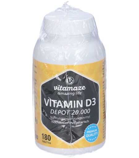 Gli integratori non sostituiscono un’alimentazione equilibrata e variegata e uno stile di vita sano. Integratore alimentare. Ingredienti: Agenti di carica (cellulosa microcristallina), amidi modificati, colecalciferolo (vitamina D3). Per 1 Tablet/ 20 Giorni Nrv* Vitamin D3: 20-Giorni dose (20000 IU) 500 mcg (1000 IU) 25 mcg 10000 % 500 % Assunzione consigliata: Prendere 1 compressa ogni 20 giorni Avvertenze: Non superare la dose giornaliera espressamente raccomandata. Tenere fuori dalla portata dei bambini al di sotto dei tre anni. Non adatto ai bambini ed agli adolescenti. Conservazione: Conservare il prodotto in confezione integra, in luogo fresco e asciutto. Si prega di fare riferimento, se necessario, ad ulteriori istruzioni riportate sulla confezione. Contenuto netto: 180 compresse = 108 g Produttore: Vitamaze GmbH Weberstrasse, 6 Heidelberg Germania ...