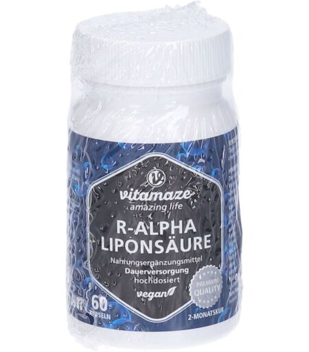 Gli integratori non sostituiscono un’alimentazione equilibrata e variegata e uno stile di vita sano. Integratore alimentare. Vegan. Ingredienti: Acido R-alfa lipoico, agenti di carica (cellulosa microcristallina), involucro della capsula (idrossipropilmetilcellulosa). Contenuti medi per 1 capsula Acido R-alfa lipoico 200 mg Assunzione consigliata: Prendere 1 capsula al giorno con acqua sufficiente. Avvertenze: Non superare la dose giornaliera espressamente raccomandata. Tenere fuori dalla portata dei bambini al di sotto dei tre anni. Non adatto ai bambini ed agli adolescenti.Non raccomandato per le persone con diabete e le donne in gravidanza e in allattamento. Conservazione: Conservare il prodotto in confezione integra, in luogo fresco e asciutto. Si prega di fare riferimento, se necessario, ad ulteriori istruzioni riportate sulla confezione. Contenuto netto: 60 capsule = 25,5 g Produttore: Vitamaze GmbH Weberstrasse, 6 Heidelberg Germania ...