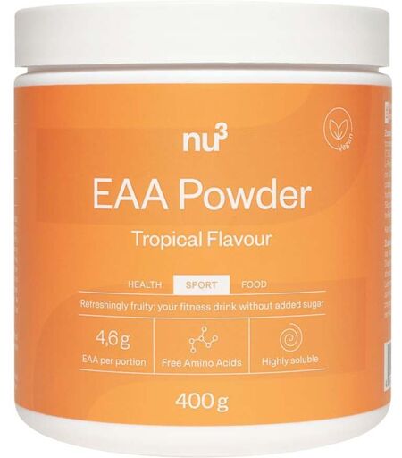 Gli integratori non sostituiscono un’alimentazione equilibrata e variegata e uno stile di vita sano. nu3 EAA Powder Tropical Resta in forma con freschezza: la polvere EAA nu3 è il supporto fruttato perfetto per il tuo allenamento. Gli EAA (aminoacidi essenziali) includono otto aminoacidi fondamentali: valina, leucina, isoleucina, lisina, metionina, fenilalanina, triptofano e treonina. Poiché il corpo non è in grado di produrli autonomamente, devono essere assunti attraverso l’alimentazione. Essendo i mattoni fondamentali delle proteine, gli aminoacidi sono essenziali per lo sviluppo e il mantenimento della muscolatura e del benessere generale. Per questo motivo, gli EAA sono particolarmente amati non solo da chi pratica sport di forza per favorire la crescita muscolare e durante le diete, ma anche dagli atleti di resistenza, che possono trarre grandi vantaggi dal loro utilizzo. L’assunzione è semplice: sciogli un misurino di polvere (10 grammi) in 300 ml d’acqua e gustalo durante l’allenamento. Ogni confezione contiene 40 porzioni. Con il suo fresco gusto tropicale, 4,6 grammi di EAA e solo 0,3 grammi di zucchero per porzione, questo fitness drink è la scelta perfetta per chi ama restare in forma! Ingredienti: Inulina, L-leucina (15%), acidificante: (acido citrico, acido L-(+)-tartarico, acido malico), L-isoleucina (7,5%), L-valina (7,5%), L-lisina cloridrato (5%), L-fenilalanina (4%), L-istidina base (4%), aroma, L-treonina (2%), aroma, edulcorante: (acesulfame-K, sucralosio), L-metionina (1,6%),), regolatore di acidità: (idrogenocarbonato di sodio), L-triptofano (0,5%), antiagglomerante: (biossido di silicio), emulsionante: (lecitina di girasole). Colorante: carotene. Può contenere tracce di glutine, uova, soia e latte. Valori nutrizionali: Informazioni nutrizionali Per 100 g Per porzione (10 g) Energia 1285 kJ 305 kcal 128 kJ 30 kcal Grassi 0,5 g ...
