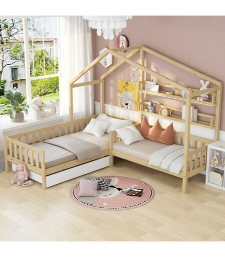 MERAX Letto per bambini 90x200 cm/140x70 cm letto da casa con cassetti e ripiani, letto da gioco in legno massello con recinzione e rete a doghe, naturale