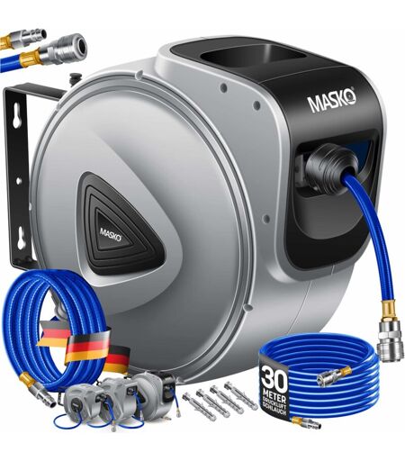 Con l'avvolgitore professionale per tubo ad aria compressa MASKO® puoi tenere tutto in ordine. MASKO invece di un fiasco! In un’officina professionale, in garage, nella stanza del bricolage, in campagna o in giardino: con l'avvolgitore per tubo automatico ad aria compressa MASKO, lavorare diventerà facilissimo. Con i nostri tubi di 10 m - 30 m di lunghezza non dovrai mai più spostare il compressore e avrai tutto sottomano per poter lavorare in modo efficiente. Grazie al supporto rimovibile da parete, l'avvolgitubo può essere facilmente montato con il kit di montaggio in dotazione e ruotato in modo flessibile di 180°. Grazie alla funzione di riavvolgimento automatico, il tubo viene arrotolato rapidamente e ordinatamente dopo l'uso. Il vantaggio del nostro avvolgitubo è che è sigillato. Grazie al design compatto, il tubo viene protetto da polvere e sporco, assicurando una durata di vita notevolmente più lunga per i tuoi tubi. Il nostro tubo si ritrae anche da solo e quindi non c'è ...