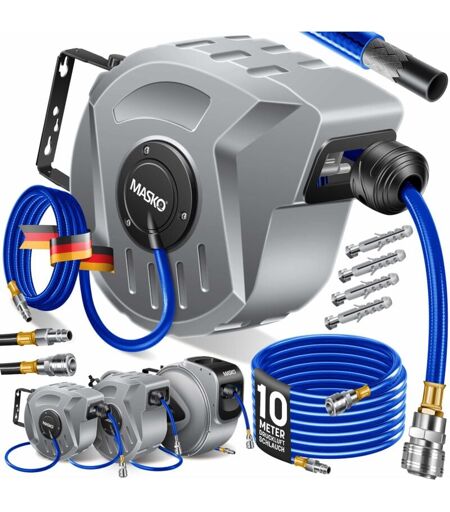 Con l'avvolgitore professionale per tubo ad aria compressa MASKO® puoi tenere tutto in ordine. MASKO invece di un fiasco! In un’officina professionale, in garage, nella stanza del bricolage, in campagna o in giardino: con l'avvolgitore per tubo automatico ad aria compressa MASKO, lavorare diventerà facilissimo. Con i nostri tubi di 10 m - 30 m di lunghezza non dovrai mai più spostare il compressore e avrai tutto sottomano per poter lavorare in modo efficiente. Grazie al supporto rimovibile da parete, l'avvolgitubo può essere facilmente montato con il kit di montaggio in dotazione e ruotato in modo flessibile di 180°. Grazie alla funzione di riavvolgimento automatico, il tubo viene arrotolato rapidamente e ordinatamente dopo l'uso. Il vantaggio del nostro avvolgitubo è che è sigillato. Grazie al design compatto, il tubo viene protetto da polvere e sporco, assicurando una durata di vita notevolmente più lunga per i tuoi tubi. Il nostro tubo si ritrae anche da solo e quindi non c'è ...