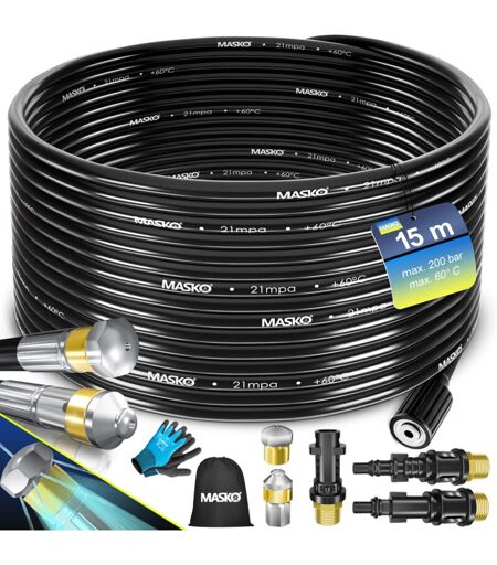 MASKO Tubo flessibile per la pulizia delle tubazioni Alta pressione di lavoro di 210 bar e una pressione massima di 529 bar, nessuna necessità di spingere nuovamente indietro grazie agli ugelli orientati all'indietro, incl. 3 adattatori per le più comuni idropulitrici ad alta pressione, ugello a rotazione e ugello standard in metallo di alta qualità Masko - Nessun fiasco con i tubi intasati Il nostro tubo è stato appositamente progettato per la pulizia delle tubazioni . Gli adattatori in dotazione permettono di utilizzare il nostro tubo di pulizia in combinazione con un'idropulitrice, rendendolo versatile. I lavori nei piccoli cantieri possono essere facilmente risolti da soli . I lavori di idraulica possono costare molto tempo e denaro. Il vostro bagno è di nuovo intasato? Scarico intasato? Nessun problema! Specialmente nei vecchi edifici le tubature possono spesso rimanere bloccate . Con la spirale svuota-tubi di MASKO potete liberare in un attimo i tubi intasati e sporchi grazie ...