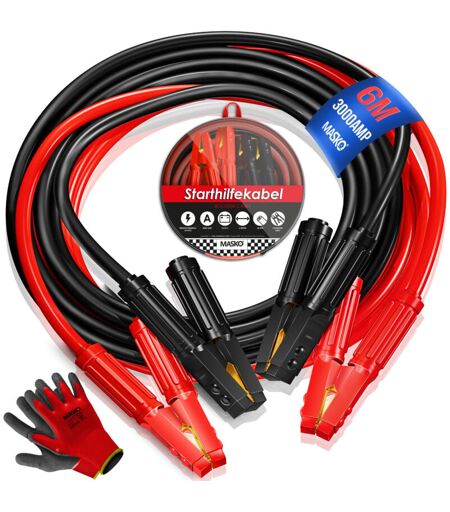 MASKO Cavo jumper per motori a benzina e diesel 6/12/24 volt. Cavo di avviamento per auto e moto in rame, inclusi guanti e borsa per il trasporto 6m /