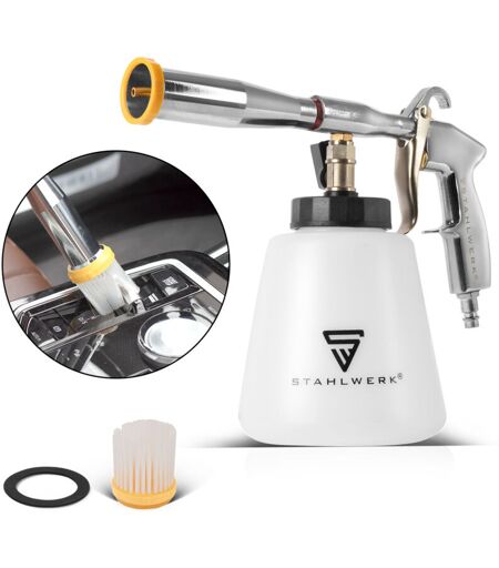 Caratteristiche La pistola ad aria compressa STAHLWERK di alta qualità è lo strumento perfetto per pulire efficacemente le superfici sporche. Grazie all'effetto tornado, la pistola ad aria compressa rimuove senza fatica anche lo sporco più ostinato. I vortici d'aria generati dalla pistola di pulizia creano un effetto di aspirazione e parte dello sporco sciolto viene risucchiato all'interno della campana di pulizia. Il pulitore per interni rimuove in modo affidabile residui, sporco e polvere da accessori, tappezzeria, headliner, bocchette d'aria, pannelli delle portiere, tappeti, tappetini, superfici in metallo, legno e plastica. La pistola di lavaggio è dotata di una valvola finemente regolabile per l'aggiunta di liquidi detergenti e può essere utilizzata con o senza detergente. Particolarmente degno di nota è il resistente ugello a getto d'aria in metallo. Rende il pulitore professionale ad aria compressa eccezionalmente robusto e garantisce prestazioni di pulizia efficienti su varie ...