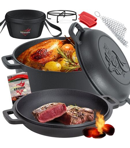 KESSER Forno olandese 2in1 pentola in ghisa 4 8L e padella 1 8L pronto all'uso bruciato incluso ricettario casseruola doppia funzione coperchio/padella nero