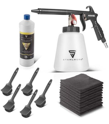 Caratteristiche La pistola ad aria compressa STAHLWERK è ideale per la pulizia precisa e selettiva di aree difficili da raggiungere. Il pulitore per interni rimuove in modo affidabile residui, sporcizia e polvere da accessori, tappezzeria, headliner, bocchette d'aria, pannelli delle porte, tappeti, tappetini, superfici in metallo, legno o plastica e molto altro ancora. Grazie alla funzione 2-in-1, l'idropulitrice ad aria compressa è molto versatile: quando la valvola di dosaggio è chiusa, il dispositivo può essere utilizzato come pistola di soffiaggio, mentre quando la valvola è aperta, può essere utilizzato come pistola di pulizia. La pistola di pulizia è dotata di una valvola di dosaggio finemente regolabile per l'aggiunta di fluidi detergenti e può essere utilizzata con o senza detergente. Il design ergonomico e il peso ridotto consentono di lavorare in modo confortevole e senza affaticarsi, anche durante lunghi periodi di lavoro. Il pulitore ad aria compressa è ideale per la ...