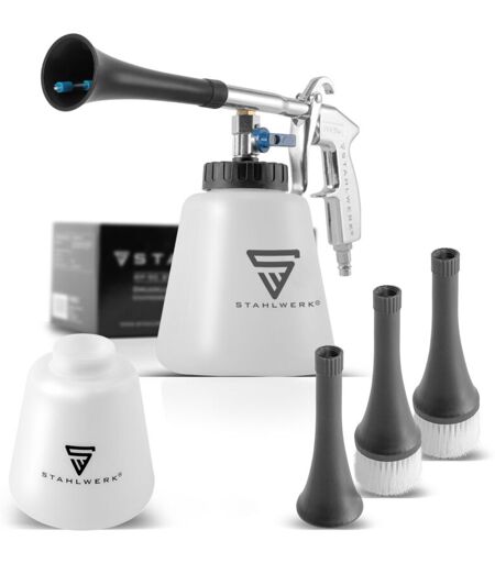Caratteristiche Lo strumento ad aria compressa perfetto per la preparazione dei veicoli: la pistola di pulizia ad aria compressa è ideale per pulire efficacemente le superfici sporche. Grazie all'effetto tornado, il potente pulitore ad aria compressa rimuove senza fatica anche lo sporco più ostinato. La pistola per la pulizia degli interni dell'auto rimuove in modo affidabile residui, sporco o polvere da accessori, tappezzeria, headliner, bocchette d'aria, pannelli delle porte, tappeti, tappetini, superfici in metallo, legno o plastica. Dotata di una valvola finemente regolabile, i fluidi detergenti possono essere aggiunti alla pistola di lavaggio, nebulizzati con il vortice e applicati in modo selettivo. Il design ergonomico e il peso ridotto della pistola di pulizia consentono di lavorare in modo confortevole e senza fatica. La pistola di lavaggio ha una finitura di alta qualità, garantisce un utilizzo sicuro e una lunga durata. La pistola di pulizia è perfetta per i lavori di ...