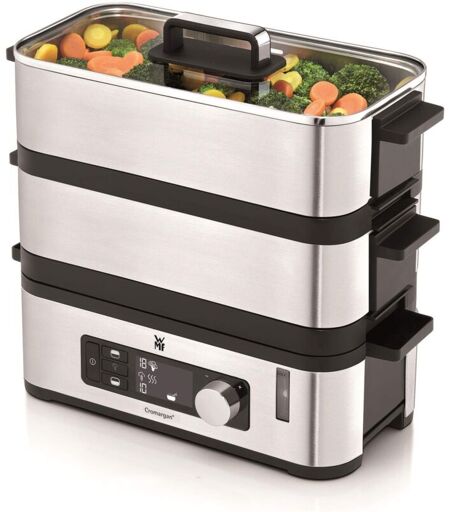 WMF - KitchenMinis Vaporiera Elettrica compatta in Acciaio Inox 18/10 Cromargan, potenza 900W, Vaporiera Elettrica a Due Ripiani, Finitura Satinata