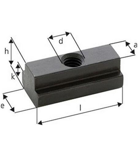 Ecrou pour rainures en T, modèle long, d x rainure en T : M12 x 14, Cote a 13,7 mm, Cote e 22 mm, Cote l : 44 mm, Cote h : 16 mm, Cote k : 8 mm - Traité pour classe de résistance 10. - Pour machines de précision, grâce à la surface d'appui plus grande les rainures sont soumises à des sollicitations plus faibles. ...