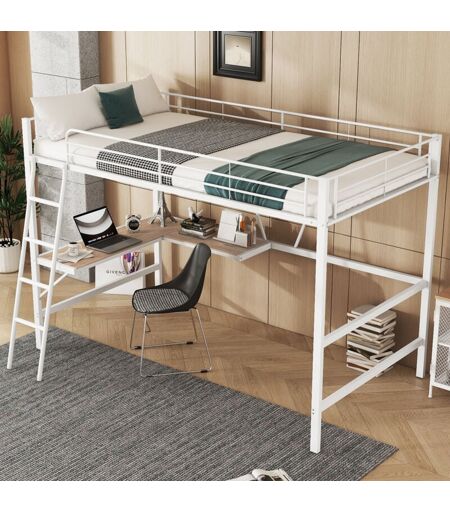 MODFU Letto a soppalco 90x200cm, letto in metallo con scrivania a l e scaffale, senza materasso, mobili da camera, bianco