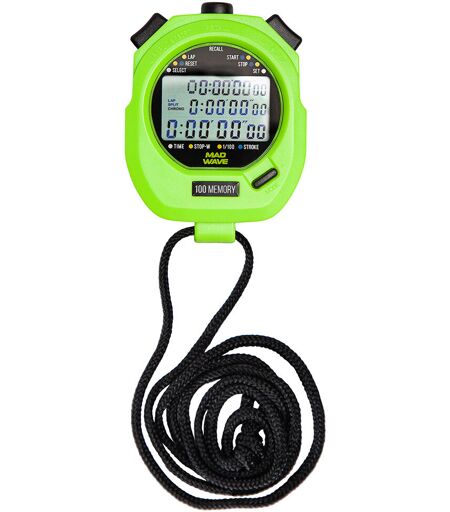 Il cronometro SW-100 di Mad Wave è un cronometro di qualità professionale.Misura in incrementi di 1/1000 di secondo.Memoria di 100 giri.Visualizza il numero di giri, il tempo di ogni giro e il tempo totale della distanza.Richiamo della memoria durante la modalità cronometro.Batteria al litio CR2032.Resistenza all´acqua - 3 bar.Non usare sott´acqua.Plastica 100%. ...