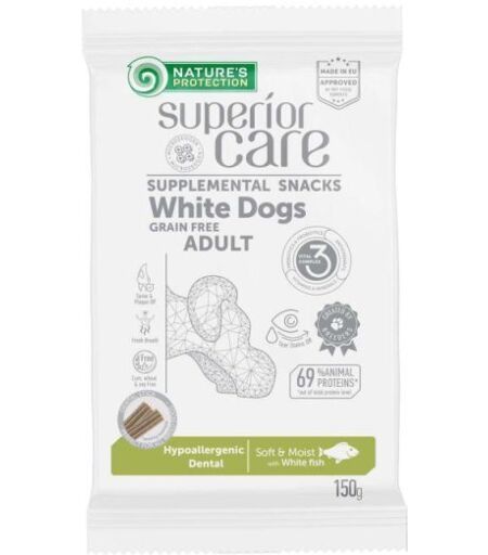 Nature's Protection Superior Care White Dogs Dental Snack with White Fish è uno snack specifico per cani dal manto bianco che aiuta a rimuovere le macchie intorno agli occhi, alla bocca e alle zampe che si creano a causa della lacrimazione e della salivaz ...