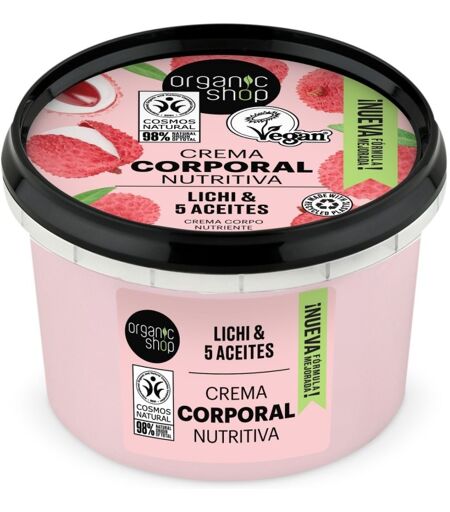 La Crema Corpo Naturale al Litchi Rosa Organic Shop con 5 Oli Biologici, dona Straordinaria Morbidezza e Nutre la pelle in profondità La Crema Corpo Naturale al Litchi Rosa Organic Shop è una deliziosa crema a base di Estratto di Litchi biologico e 5 Oli biologici: Avocado, Borragine, Germe di grano, Burro di Cacao e Burro di Karitè. \n La sua formulazione naturale nutre la pelle, donando una straordinaria morbidezza. \n Contiene una semplice combinazione di ingredienti naturali con estratti e oli biologici certificati in un imballaggio semplice e sicuro. \n Non contiene parabeni, SLS, olio minerale, polietilene. \n Questa crema, come gli altri prodotti Organic Shop, è certificata dallo standard internazionale COSMOS NATURAL \n Modo d\'uso: Applica una piccola quantità di prodotto sulla pelle pulita del corpo massaggiando fino ad assorbimento. \n INCI: Aqua, Octyldodecanol, Cetearyl Alcohol, Glyceryl Stearate, Butyrospermum Parkii Butter, Hydrogenated Starch Hydrolysate, Glycerin, Coco-Caprylate Caprate, Caprylic/Capric Triglyceride, Litchi Chinensis Fruit Extract*, Persea Gratissima Oil*, Theobroma Cacao Seed Butter*, Triticum Vulgare Germ Oil*, Borago Officinalis Seed Oil*, Tocopherol, Xanthan Gum, Sodium Stearoyl Glutamate, Benzyl Alcohol, Dehydroacetic Acid, Sodium Benzoate, Potassium Sorbate, Citric Acid, Parfum, Limonene, Linalool, Benzyl Benzoate, CI 77491, CI 77492. \n *da agricoltura biologica ...