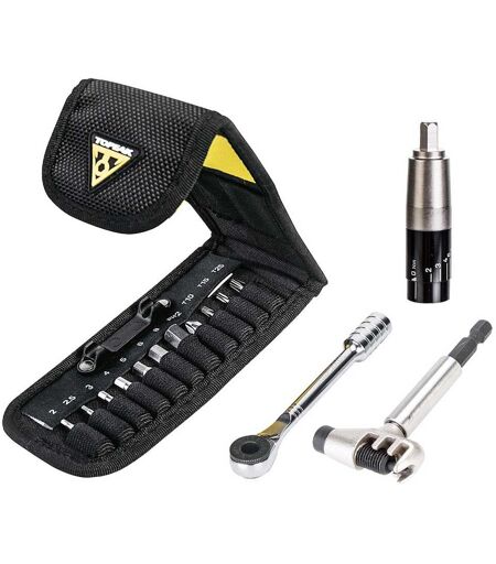 Il Topeak Ratchet Rocket Lite Ntx + ha tutto il necessario per riparare e apportare regolazioni precise alla tua bici mentre sei in viaggio. Dotato di un meccanismo a cricchetto a denti fini con leva inversa e rotella zigrinata con coppia di torsione regolabile per facilità e precisione nei punti stretti. Include porta inserti magnetico, utensili in acciaio temprato in 2, 2,5, 3, 4, 5, 6 e 8 mm esagonale, T10, T15, T25 Torx®, punte Phillips n. 2 e utensile per catena in acciaio Crmo. La custodia protettiva mantiene le cose organizzate e sicure e ha anche una tasca per trasportare cerotti senza colla.L'utensile per catena è compatibile con catene a velocità singola e multipla fino a 12 velocità, escluse le catene a perno cavo Campagnolo®.Caratteristiche:Cricchetto reversibile con azione a rotellaIl supporto magnetico protegge i bit e aumenta la levaTorqbit è compatibile con il driver a cricchetto reversibile. Gamma di coppia: 2 6 NmAggiunto T15 Torx® Bit per l'installazione dell'accessorio Ninja sulla serie Tri Cage con facilitàSi ripone ordinatamente in una piccola custodia in nylonSpecifiche:Funzioni: 19Materiale dello strumento a cricchetto: acciaio al cromo vanadioBorsa: nylonCaratteristiche aggiuntive: cacciavite, recinzione di collegamento a catena secondaria, rompi perni di catena, leva aggiunta, tasca applicata, porta bit magneticoDimensioni: 13 x 6,5 x 3,3 cm / 5,1 x 2,6 x 1,3 Peso: 240 G / 8,46 OzUtensili:Coppia di torsione regolabile: 2 6 NmPunte a brugola 2 / 2,5 / 3/4/5/6/8 mmPunte Torx® T10 / T15 / T25Cacciavite Phillips n. 2, utensile per catena in acciaio Crmo *, utensile a cricchetto ...