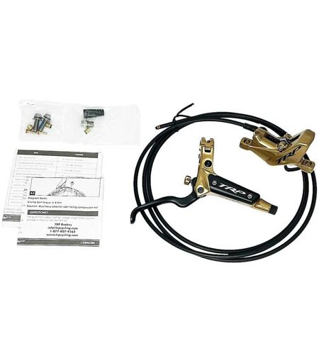 Freno a disco idraulico TRP DH-R EVO Gold HD-M846, oro / nero, pinza freno a 4 pistoncini, leva del freno e pinza in alluminio forgiato lavorato CNC, leva del freno ergonomica in alluminio progettata da Aaron Gwin, regolazione della distanza, compatibile con Matchmaker X e I-Spec II, a base di olio minerale TRP, pistone ibrido, pastiglie dei freni in resina, lunghezza della linea di 1900 mm con 5.0 mm, per spessore del rotore di 2.3 mm (TRP R1), rotore e adattatore non sono inclusi.SPECIFICHE:-destra. ...