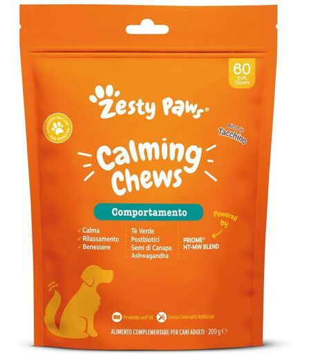 Zesty Paws® Calming Chews Integratore Comportamento Zesty Paws® Calming Chews è un delizioso prodotto da masticare che aiuta i cani in condizioni di normale stress, nervosismo e iperattività a sentirsi a proprio agio. - Tè Verde: Aiuta a promuovere un senso di rilassamento e di calma. - Ashwagandha: Aiuta a promuovere la concentrazione ed il rilassamento dai fattori di stress esterni. - L-triptofano: È un aminoacido che può contribuire a ridurre l’iperattività e l’irrequietezza per favorire il rilassamento. - Priome® Ht-Mw Blend: È una miscela postbiotica. Modo d'uso: Somministrare come bocconcino o ricompensa in qualsiasi momento, nell’ambito di una dieta equilibrata. Peso Quantità Giornaliera Massima Fino a 15 kg 1 15–30 kg 2 +30 kg 3 Tenere sempre a disposizione acqua fresca da bere. I cani devono essere sempre sorvegliati durante l'alimentazione. Non utilizzare se il sigillo di sicurezza è rotto o mancante. Non adatto ai cuccioli di età inferiore ai 4 mesi. Conservare in un luogo fresco e asciutto. Ingredienti: Farina di Tacchino (16%), Fiocchi di Piselli, Polpa di Barbabietola, Fiocchi di Patate, Glicerina Vegetale, Semi di Canapa (7,2%), Amido di Tapioca, Farina di Alghe*, Camomilla in Polvere, Foglie di Tè Verde in Polvere (1,8%), Radice di Valeriana in Polvere, Passiflora in Polvere, Ashwagandha in Polvere (0,8%), Priome® Ht-Mw Blend (0,3%): Maltodestrina, Batteri Inattivati (Bifidobacterium longum, Lactobacillus Rhamnosus), Olio di Semi di Girasole. * Farina di Alghe contente mix di Ulva sp., Gracilaria sp e Ascophyllum nodosum Additivi per kg: Conservanti, Aromazzanti, Aminoacidi: L-triptofano 8400 mg/kg. Componenti Analitici: Energia 292 kcal/100g, Umidità 22%, Proteina Grezza 17%, Grassi Grezzi 5,5%, Ceneri Grezze 8%, Fibre Grezze 4%. ...