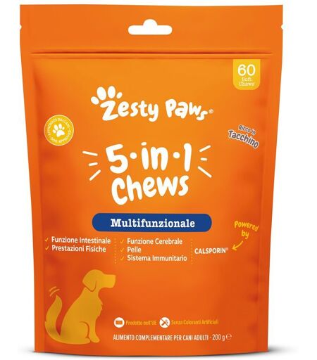 Zesty Paws® 5 in 1 Chews integratore Multifunzionale Potente supporto 5-in-1 con probiotici e vitamine. - Calsporin® (Bacillus velezensis DSM 15544): Aiuta a sostenere la salute dell’intestino. - Vitamina B3 (Niacinamide): Aiuta a sostenere la normale funzione intestinale. - Vitamina A: Aiuta a sostenere l’immunità e a ridurre lo stress ossidativo. - L-carnitina: Aiuta a sostenere i muscoli e le prestazioni fisiche. - Vitamina B5 (Calcio D-Pantotenato): Aiuta a sostenere la normale funzione cerebrale. - Biotina: Aiuta a sostenere la normale salute della pelle. Modo d'uso: Somministrare come bocconcino o ricompensa in qualsiasi momento, nell’ambito di una dieta equilibrata. Peso Quantità Giornaliera Massima Fino a 15 kg 1 15–30 kg 2 +30 kg 3 Tenere sempre a disposizione acqua fresca da bere. I cani devono essere sempre sorvegliati durante l'alimentazione. Non utilizzare se il sigillo di sicurezza è rotto o mancante. Non adatto ai cuccioli di età inferiore ai 4 mesi. Conservare in un luogo fresco e asciutto. Ingredienti: Fiocchi di Patate, Farina di Tacchino (16%), Fiocchi di Piselli, Glicerina Vegetale, Polpa di Barbabietola, Amido di Tapioca, Farina di Alghe*, Olio di Semi di Girasole, Sostanze Minerali. * Farina di Alghe contente mix di Ulva sp., Gracilaria sp e Ascophyllum nodosum Additivi per kg: Conservanti, Aromatizzanti, Vitamine: L-carnitina 36000 mg/kg, Vitamina A 300 mg/kg, Vitamina B1 600 mg/kg, Vitamina B2 300 mg/kg, Niacinamide 5400 mg/kg, Calcio D-pantotenato 300 mg/kg, Vitamina B6 300 mg/kg, Biotina 6 mg kg, Acido folico 63 mg/kg, Vitamina B12 1,50 mg/kg, Vitamina C 6000 mg/kg, Oligoelementi: Manganese (ossido di manganese (Ii)) 180 mg/kg, Stabilizzatore della flora intestinale: Calsporin® Bacillus velezensis DSM 15544 (3x1011 CFU/kg). Componenti Analitici: Energia 273 kcal/100g, Umidità 22%, Proteina Grezza 17,5%, Grassi Grezzi 3,5%, Ceneri Grezze 11%, Fibre Grezze 2,5%. ...