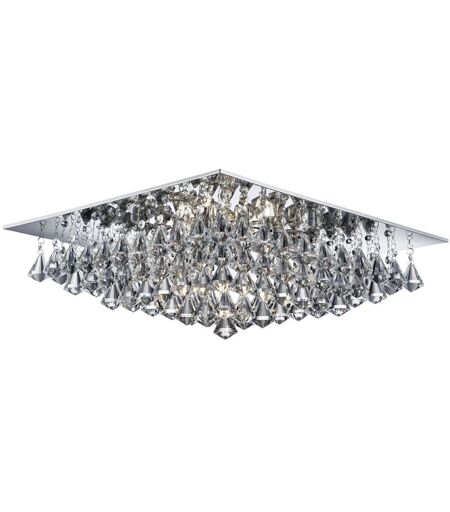 Collezione Hanna LUCE LUSSUOSA Questo raccordo da soffitto quadrato Hanna cromato a 8 luci con gocce piramidali in cristallo trasparente sembra spettacolare su qualsiasi soffitto. La lussuosa lampada si adatta al soffitto e presenta otto lampade circondate da decadenti rifiniture in cristallo e gocce piramidali. L'elegante piastra posteriore quadrata a specchio completa il look di questo grande lampadario contemporaneo. ...
