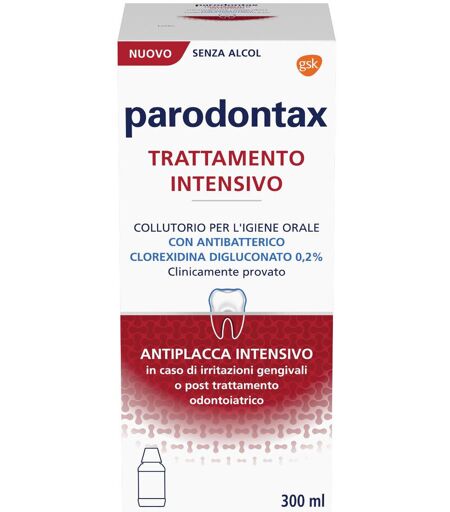 PARODONTAXTRATTAMENTO INTENSIVODescrizioneCollutorio per l'igiene orale con antibatterico, antiplacca intensivo particolarmente utile in caso di irritazioni gengivali causate da un’eccessiva formazione di placca batterica.PARODONTAX TRATTAMENTO INTENSIVO con antibatterico è appropriato anche in seguito a un trattamento odontoiatrico e per il mantenimento dell'igiene orale particolarmente in persone che hanno difficoltà ad attuarla meccanicamente.Clinicamente provato.Modalità d'usoMisurare 10 ml utilizzando il tappo della confezione e sciacquare accuratamente la bocca per un minuto due volte al giorno. Sputare dopo l’uso.Non risciacquare con acqua. Non bere direttamente dalla bottiglia. Non ingerire. Tenere fuori dalla portata dei bambini. Nei bambini sotto i 12 anni chiedere consiglio al dentista o al medico prima dell’utilizzo.ComponentiAqua, sorbitol, glycerin, PEG-40 hydrogenated castor oil, aroma, chlorhexidine digluconate.Contiene clorexidina digluconato 0,2% p/v.AvvertenzeNon utilizzare se è allergico ad uno qualsiasi degli ingredienti (es. alla clorexidina digluconato).Non utilizzare da nessun altra parte oltre che la bocca.Se il prodotto viene a contatto con gli occhi o le orecchie, sciacquare subito con acqua.Può comparire una temporanea colorazione della lingua e dei denti. Le macchie non sono permanenti e possono essere in gran parte prevenute riducendo il consumo di alimenti o bevande che possono macchiare, come tè, caffè e vino rosso.Le macchie possono essere controllate con lo spazzolamento ma in alcuni casi può essere necessaria una pulizia professionale.Si consiglia di non usare PARODONTAX TRATTAMENTO INTENSIVO collutorio subito dopo l’uso del dentifricio.In alternativa, dopo lo spazzolamento sciacquare la bocca con acqua e attendere 5 minuti prima di utilizzare PARODONTAX TRATTAMENTO INTENSIVO collutorio.Sospendere l’utilizzo del prodotto e rivolgersi immediatamente ad un medico o ad un dentista in caso di comparsa di gonfiore o irritazione della bocca, eruzione cutanea, rigonfiamento di labbra, lingua, gola o faccia o in caso di difficoltà respiratorie.Sebbene rari, tali effetti potrebbero essere segni di una reazione allergica.Non eccedere le quantità consigliate.È possibile notare alterazioni del gusto, sensazioni di formicolio o bruciore al primo utilizzo. Questi effetti solitamente diminuiscono con l’uso continuato. In caso persistano, consultare il medico o il dentista.Non utilizzare se la confezione è danneggiata.ConservazioneValidità post-apertura: 3 mesi.FormatoFlacone da 300 ml. ...