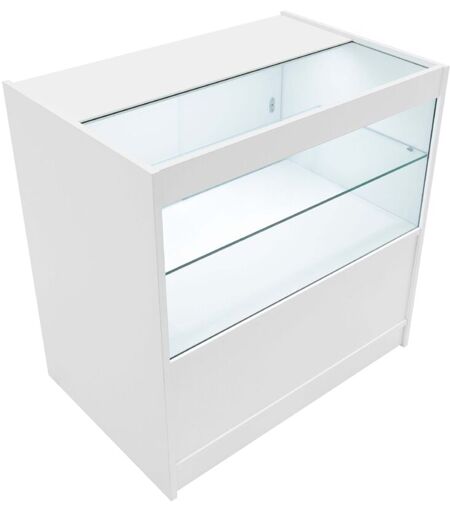 Monster Cable Bancone da Negozio LED Bianco C900 – Vetrina con Ante Scorrevoli Bloccabili, 2 Chiavi, 3 Ripiani (2 Aperti, 1 Chiuso), Illuminazione Bianca, MDF