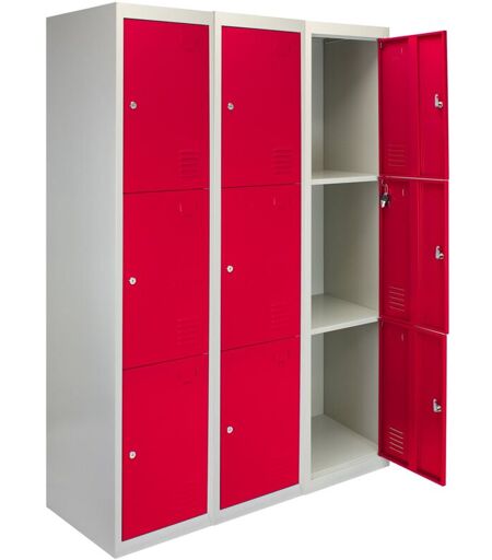 Questi armadietti in metallo con 3 porte sono fatti di durevole acciaio ricoperto di polvere, inoltre sono molto pratici e sicuri grazie alla serratura con chiave. Con 45cm di profondità, 38cm di larghezza e 180cm di altezza, questi spaziosi armadietti forniscono un ampio spazio dove riporre in maniera sicura i tuoi vestiti e oggetti personali. Caratteristiche del prodotto 3 armadietti verticali con 3 porte da montare Ogni armadietto misura 45cm (profondità) x 38cm (larghezza) x 180cm (altezza) 2 magneti e targhette per i nomi GRATUITI Portabiglietto per nome/numero sulla parte frontale di ogni porta Ogni porta ha delle fessure da dove passa l’aria 2 chiavi per ogni porta Fatti di solido acciaio Struttura grigia e porte rosse ricoperte di polvere Questi armadietti con 3 porte offrono uno spazio sicuro di immagazzinamento per 3 persone, ma perchè non comprarne di più per creare un gruppo di armadietti ideale per scuole, palestre, spogliatoio e stanze per il personale. ...