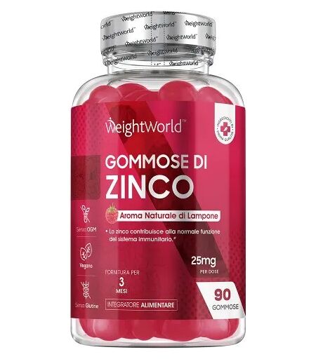 WeightWorld Zinco 25 mg 90 Gommose Vegane (6 Mesi) Integratore per Difese Immunitarie, Pelle, Unghie e Ossa Gusto Lampone Naturale