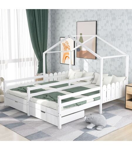 MERAX Letto per bambini 90x200cm/90x200cm, Casa letto per 2 bambini con letto matrimoniale diviso, 2 cassetti su rotelle, protezione anticaduta e rete a