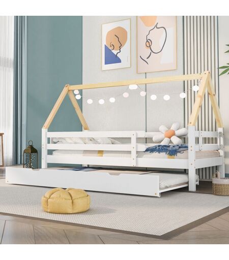 MERAX Letto per bambini 90x200 cm letto estraibile con protezione anticaduta e cassetto, divano letto scorrevole con ruote, giroletto singolo in pino,