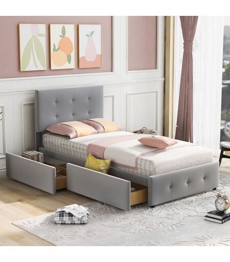 MERAX Letto imbottito 90 x 200 cm, schienale e due cassetti Letto singolo Testiera regolabile in altezza Tessuto vellutato, Grigio