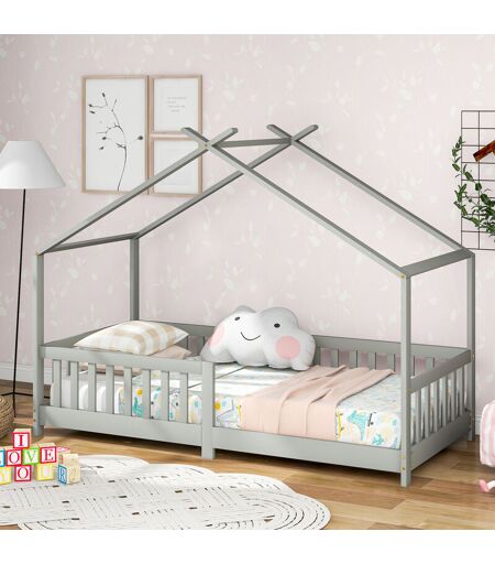 MERAX Letto per Bambini a Forma di Casetta con Barriera Anticaduta 90 x 200 cm Lettino in Legno di Pino con Sponde / Sbarre di Sicurezza grigio