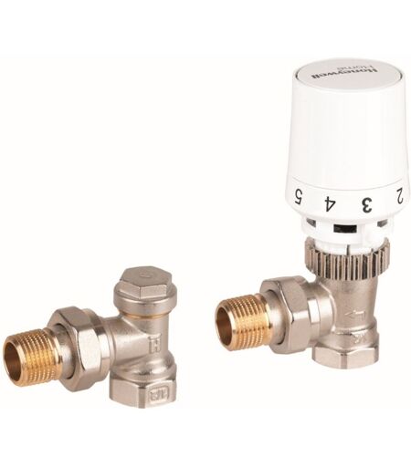 Kit per radiatori ad alimentazione laterale: testa T5019 + valvola termostatica ad angolo con preregolazione V2020ESX15 + valvola di ritorno ad