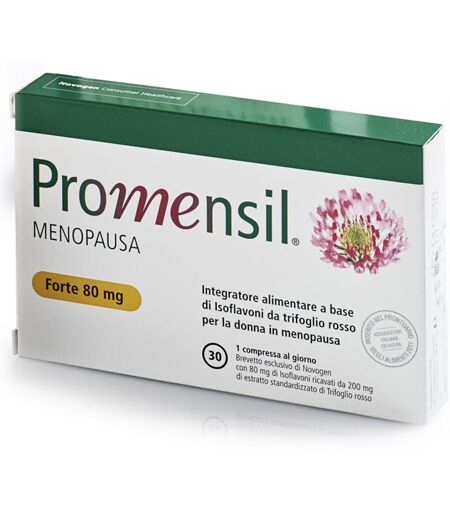 PROMENSIL FORTE - Integratore alimentare a base di Trifoglio rosso titolato in Isoflavoni utile per contrastare i disturbi della menopausa. Ogni compressa di Promensil Menopausa contiene 4 isoflavoni (genisteina, daidzeina, formononetina e biochanina A) pari a 40 mg (80 mg in Promensil Forte), otte… ...