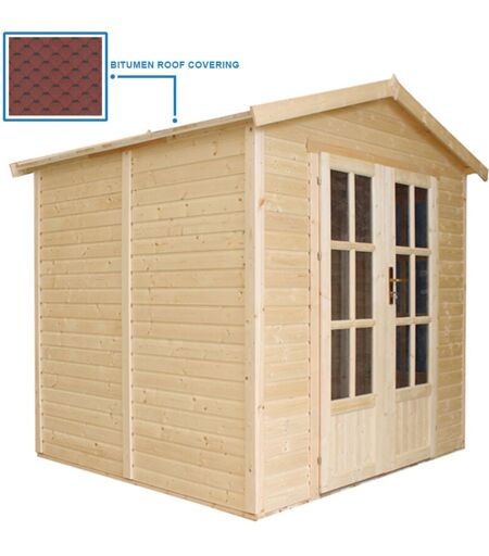 TIMBELA Ufficio in legno da giardino con tegole bituminose di colore rosso W233xD222xH233cm, Cabina da giardino, Capanno giardino chiudibile, Home office,