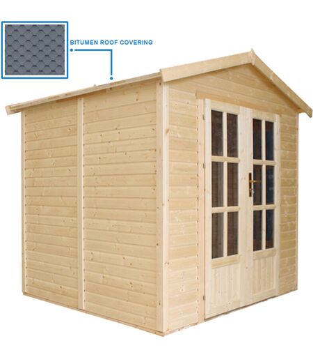 TIMBELA Ufficio in legno da giardino con tegole bituminose di colore grigio W233xD222xH233cm, Cabina da giardino, Capanno giardino chiudibile, Home office,