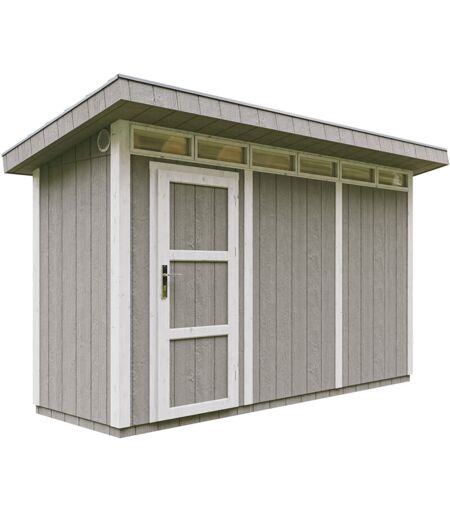TIMBELA Casetta da Giardino di QUALITÀ PREMIUM 4,3m²-L161xW411cm-con Pavimento, Tegole Bituminose,Set di Vernici-Costruzione con pannelli LP Smartside