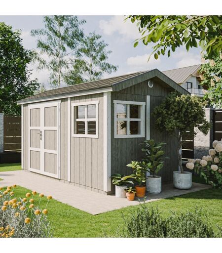 TIMBELA Casetta da giardino di qualità premium 8,68 m² - H252x250x412 cm - Costruzione in pannelli lp Smartside - Con pavimento e Tegole Bituminose