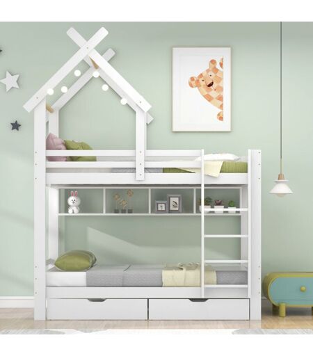OKWISH Letto a castello con cassetti e ripiani, letto a casetta con scala ad angolo retto a tre gradini, lettino per bambini con protezione anticaduta e