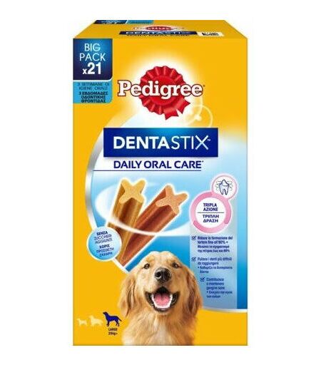 Pedigree Dentastix Multipack Large 21PZ alimento complementare per cani di taglia grande (più di 25KG) dai 4 mesi d'età. Snack dentale per una corretta igiene orale con tripla azione, scientificamente provato. 4 cani su 5, oltre i 3 anni, hanno problemi alle gengive causati dalla formazione di placca e tartaro. Pedigree DentaStix Daily Oral Care è lo snack con Tripla Azione che, è scientificamente provato, aiuta a ridurre la formazione del tartaro fino all'80%, pulisce i denti più difficili da raggiungere e contribuisce a mantenere gengive sane. Senza zuccheri aggiunti, coloranti e aromi artificiali e a ridotto contenuto di grassi. ...