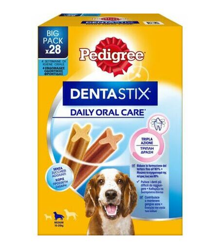 Pedigree Dentastix Multipack Medium 28PZ alimento complementare per cani tra i 10 e i 25G. Snack dentale per una corretta igiene orale con tripla azione, scientificamente provato. Snack con Tripla azione per l'igiene orale dei tuo cane. 4 cani su 5, oltre i 3 anni, hanno problemi alle gengive causati dalla formazione di placca e tartaro. Pedigree DentaStix Daily Oral Care è lo snack con Tripla Azione che, è scientificamente provato, aiuta a ridurre la formazione del tartaro fino all'80%, pulisce i denti più difficili da raggiungere e contribuisce a mantenere gengive sane. ...