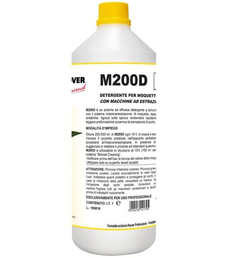 M200D è un detergente s uperattivo rapido a bassa schiuma e media alcalinità per la pulizia di tappeti e moquettes con macchina a iniezione/estrazione. M200D pulisce a fondo e ravviva i colori e diffonde nell’ambiente un gradevole profumo di pulito che permane a lungo. M200D non provoca incrostazioni nella macchina a iniezione/estrazione. M200D non lascia residui sulla superficie tessile che possono attirare nuova sporcizia. M200D è efficace contro tutti i tipi di sporco e asciuga rapidamente ed è quindi adatto anche per la pulizia rapida col sistema “Bonnet Cleaning”. M200D è disponibile in flacone di plastica da 1L CAMPI DI APPLICAZIONE M200D si impiega per la pulizia di tutti i rivestimenti tessili in fibra sintetica, moquettes, tappeti, tappezzerie. MODALITÀ DI IMPIEGO Aspirare la moquette. Verificare la stabilità del colore facendo una prova su una porzione nascosta di moquette. Precondizionare la moquette nebulizzando sopra le aree più sporche una soluzione 1:3-1:4 di M203 in ...