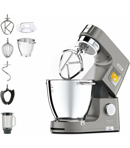Descrizione Kenwood Titanium Chef Patissier XL, Potenza 1400W, SILVER,con sistema Easy Warm per scaldare gli ingredienti, ciotola da 7L in acciaio inox, bilancia integrata, schermo touch da 2.4”a colori, 6 programmi preimpostati, sistema di illuminazione all'interno della ciotola, 4 utensili per la miscelazione ( Frusta a K in acciaio inox, Frusta a fili, gancio impastatore, spatola per la pasticceria). In dotazione Frullatore in vetro. Piedini antiscivolo. Vano alloggiacavo. Contenuto della confezione Impastatrice, set da pasticceria 4 pezzi (gancio K, gancio per impastare, asta in acciaio inossidabile, elemento frusta flessibile), boccale da 7 litri, attacco per mescolare in vetro. ...