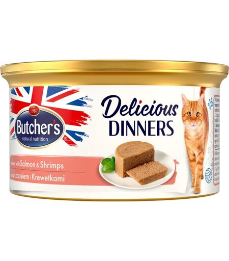 AIRBUTLER Butcher's Delicious Dinners, cibo per gatti, con salmone e gamberetti, mousse 85 g