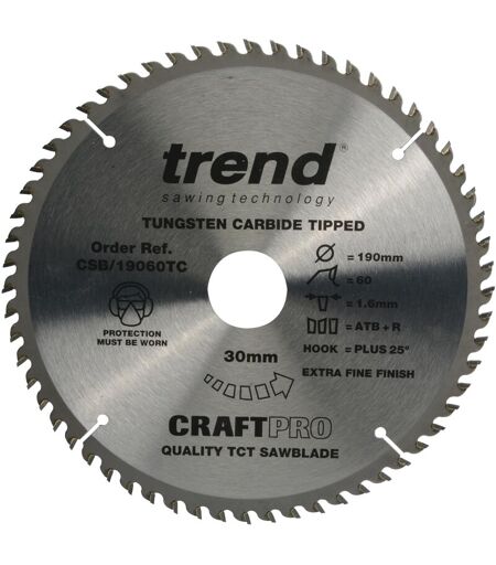 Trend Lama per sega circolare CraftPro Thin Kerf tct, diametro 190 mm x 60 denti x foro 30 mm, punta in carburo di tungsteno, CSB/19060TC -
