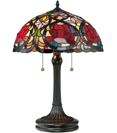 Collezione Larissa MOTIVO ART NOUVEAU Lampada da tavolo a 2 luci. Questa splendida collezione in stile Tiffany è caratterizzata da un paralume in vero vetro artistico lavorato a mano e realizzato in ricche tonalità gioiello e in tenui toni pastello. Il vetro è disposto in un classico motivo Art Nouveau. La tavolozza di colori caldi crea un armonioso equilibrio di luce e la base complementare è rifinita in bronzo vintage. ...