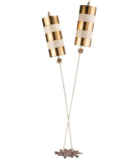 Descrizione Lampada da terra con base a forma di stella seghettata incisa in foglia d'argento per assomigliare a strade di ciottoli. Punte decorative dello stelo in foglia d'oro, sfumature oro e talpa a strisce. Dettagli • Tipo di prodotto: Lampada da terra • Altezza in cm: 198.1 • Larghezza in cm: 63.5 • Lunghezza in cm: 35.6 • Materiale: acciaio dolce • Finitura: oro e tortora • Numero di prese: 2 • Potenza massima: 60W • Attacco: E27 • Lampadina inclusa: no • Tensione: 220-240V 50hz • Classe di protezione: Classe I ...